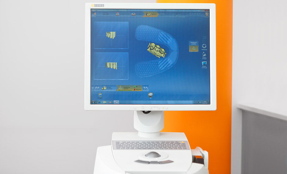 Das Cerec-System, bestehend aus digitaler Kamera, Computer und spezieller Schleifeinheit ermöglicht die Erstellung von Veneers, Kronen, Teilkronen oder Inlays aus Vollkeramik.